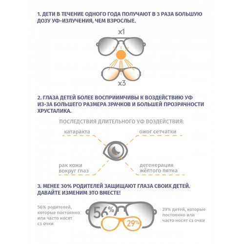 Оправа данных очков имеет удобную и эргономичную форму, которая обеспечивает им безупречную посадку. К тому же, такая оправа выполнена из мягкого, приятного на ощупь прорезиненного материала, которые может похвастать не только высокой прочностью, но и великолепной гибкостью. Стекла высочайшего качества в данной модели являются ударопрочными, что обеспечивает им абсолютную защищенность от любого рода механических повреждений. Очки Navigator на 100 % защищают глаза малышей от яркого солнечного света.